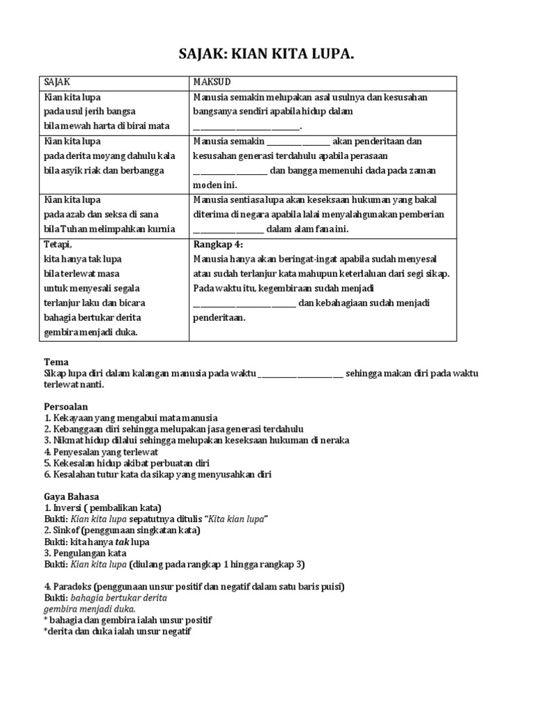 Kian Kita Lupa Tingkatan 1 - Paradoks (penggunaan unsur positif dan negatif dalam satu baris puisi) bukti:. Kian kita lupa pada derita moyang dahulu kala bila asyik riak dah berbangga. Paradoks (penggunaan unsur positif dan negatif dalam satu baris puisi) bukti: Kian kita lupa pada usul jerih bangsa bila mewah harta di birai mata kian kita lupa pada derita moyang dahulu kala bila asyik riak dan berbangga kian kita lupa pada azab dan seksa di sana bila tuhan melimpahkan kurnia. Kian kita lupa (diulang pada rangkap 1 hingga rangkap 3) 4. Kerana mereka hijau kian pudar
