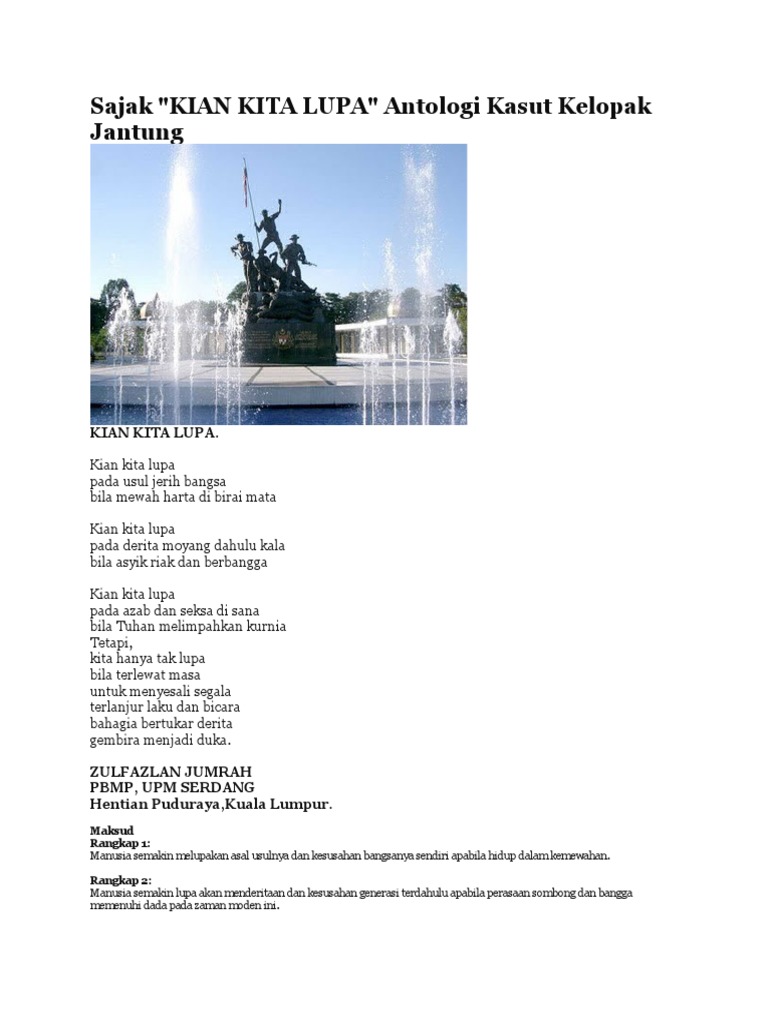 Sajak Kian Kita Lupa Tingkatan 1 from 3.bp.blogspot.com Paradoks (penggunaan unsur positif dan negatif dalam satu baris puisi) bukti: Kian kita lupa t1 rangkap 1 manusia semakin melupakan asal usulnya dan kesusahan bangsanya sendiri apabila hidup dalam kemewahan. Kian kita lupa (diulang pada rangkap 1 hingga rangkap 3) 4. Kian kita lupa sajak komsas tingkatan 1 (history rebuke the present, shape the future) pengenalan puisi karya zulfazlan jumrah yang mengandungi empat rangkap menghiasi slot pertama daripada enam buah sajak pilihan dalam antologi kasut kelopak jantung, iaitu pada muka surat 19. Sajak kian kita lupa (tingkatan 1) sajak kian kita lupa kkj tg1. Tetapi kita hanya tak lupa bila terlewat masa untuk menyesali segala terlanjur lak dah bicara bahagia bertukar derita gembira manjadi duka. Ia mempunyai seramai 72 orang guru. Permohonan mrsm tingkatan 1 & 4 2020 (kemasukan 2021) ibu bapa yang berminat untuk menghantar anak ke mrsm (samada tingkatan 1 atau tingkatan 4), boleh baca perkongsian tentang permohonan mrsm online di sini.