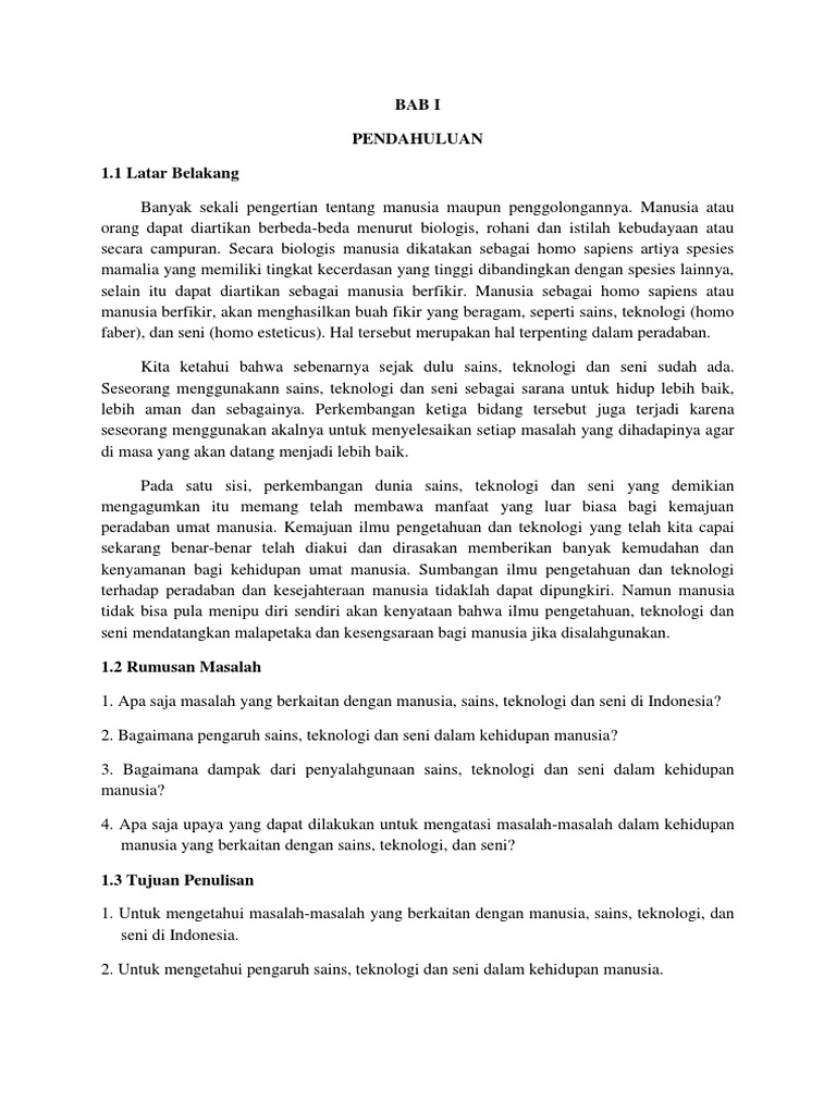 Sains dan teknologi dilihat sebagai satu perkara yang prima dalam kehidupan manusia sejak memasuki abad ke 21. Beberapa isu berkaitan dengan perkembangan teknologi semasa. Manusia, sains, teknologi, dan seni. Perkembangannya dilihat tumbuh ibarat cendawan selepas hujan apabila kos menggunakan teknologi semakin berpatutan dan dikomersialkan sesuai dengan kehidupan manusia. Makna sains, teknologi dan seni bagi manusia manusia adalah sautu makhluk tuhan yang paling sempurna keadaanya selain di beri bentu. Ilmu sosial dan budaya dasar. 2.2 hubungan antara manusia sains,teknologi dan seni hubungan sains dan teknologi mengalami perkembangan dari abad ke abad. Manusia sebagai subyek dan obyek bagi sains, teknologi dan seni. Dalam kepustakaan, teknologi memiliki berbagai ragam pendapat yang menyatakan teknologi adalah transformasi kebutuhan (perubaan bentuk dari. Hal itu merupakan sarana bagi kesempurnaan manusia sebagai hamba allah dan khalifah di muka bumi. Sains tidak terpisah dari teknologi. Baik sains, teknologi dan hasil produknya dapat dirasakan disetiap aspek kehidupan manusia. Tetapi, dampak perkembangan sains dan teknologi terhadap alam indonesia sangatlah buruk.